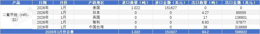 2026年1月份中国制冷剂R32进出口统计(产销地区)