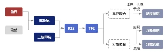PTFE由单体四氟乙烯(TFE)聚合而成,由于TFE在常温下为气态,并且有毒性,运输困难,厂商大多将R22作为原料,合成TFE,再制备PTFE。此处合成高分子用途的R22不受配额管制,只有制冷剂用途的R22受配额管制。目前国内生产企业均为一体化产业链配套企业。