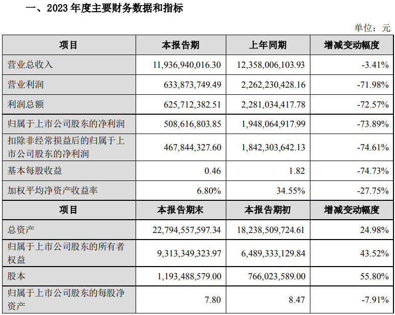 3月28日晚间,多氟多披露2023年年报。数据显示,多氟多2023年实现营收119.37亿元,同比下降3.41%;归属于上市公司股东的净利润5.1亿元,同比下降73.83%。