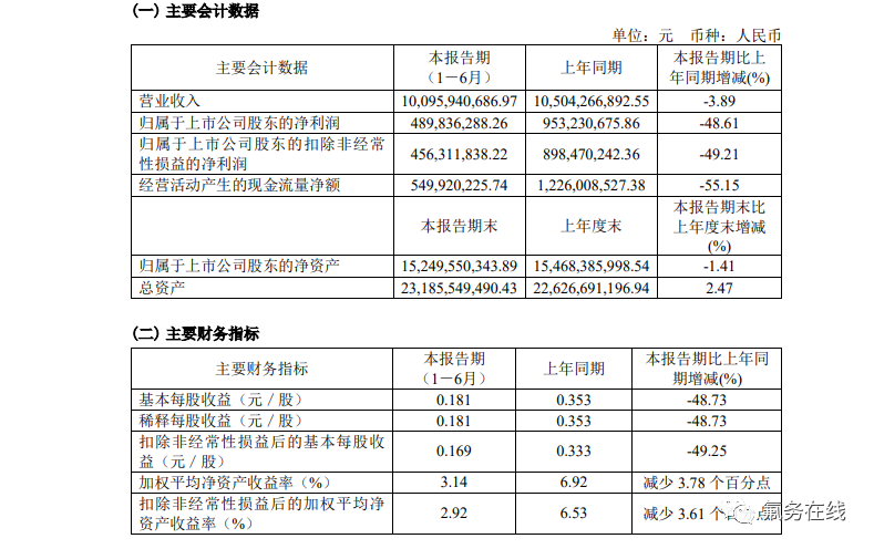 巨化股份:上半年归母净利润同比下降48.61%至4.9亿元