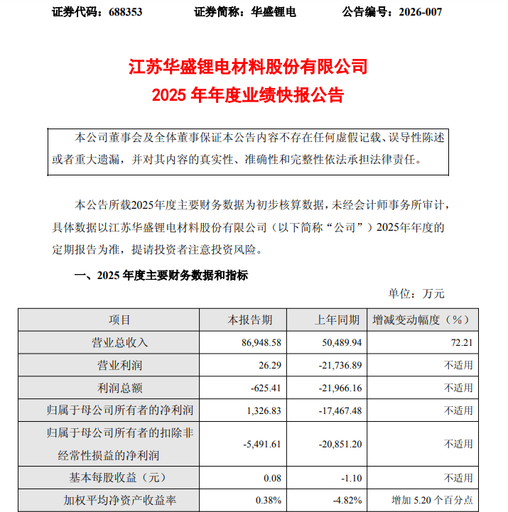 2月27日晚间华盛锂电披露2025年业绩快报,公告指出,2025年公司实现营业收入8.69亿元,较上年同期增长72.21%;实现归属于母公司所有者的净利润1,326.83 万元,与上年同期相比,实现扭亏为盈。