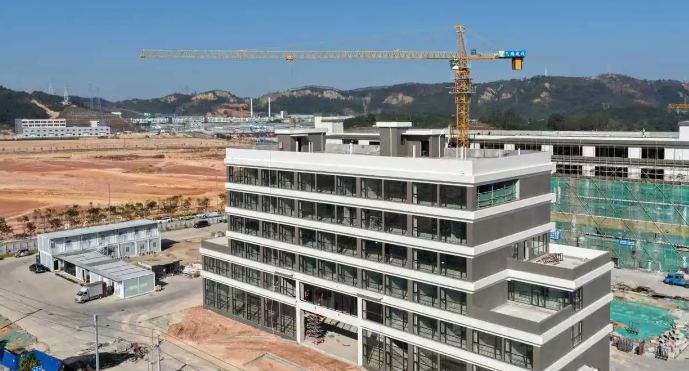 近日,塔吊林立、车辆穿梭,清远高新区电子信息产业园内,一派繁忙建设景象。位于园内的清远市合意氟塑电线有限公司建设现场,厂房主体已全面封顶,工人们正紧张进行内外墙及生产车间装修。