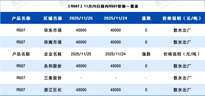 【R507】11月25日国内R507价格一览表