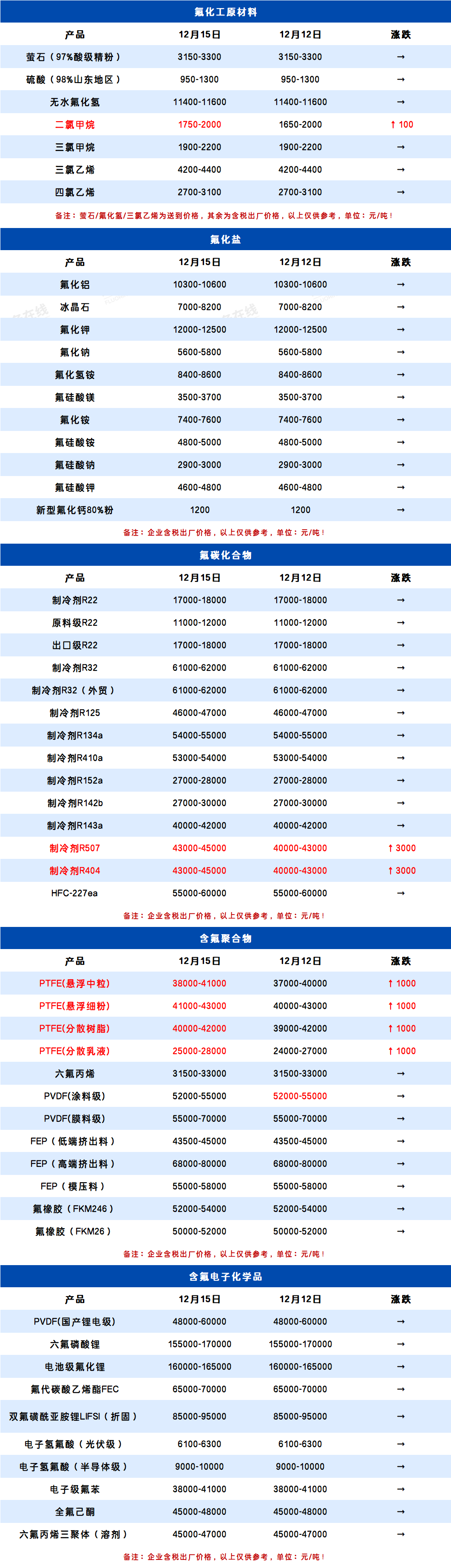 12月15日氟化工产业链价格表