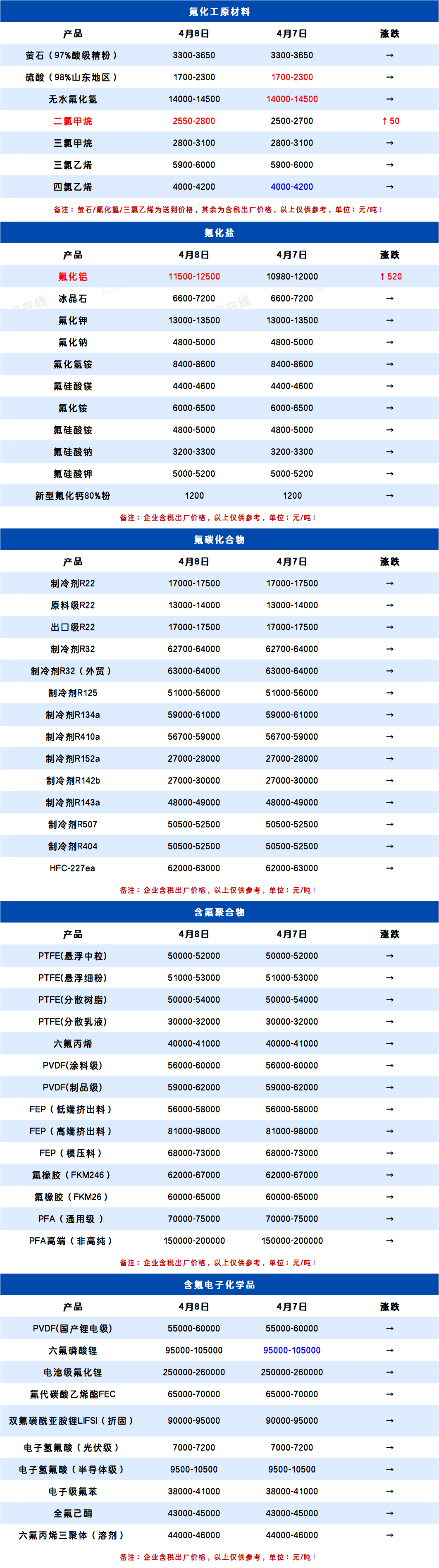 所属分类:全产业链价格表 阅读次数:29 发布时间:2026-04-08 内容来源:氟务在线