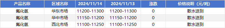 2024年11月14日国内氟化氢价格一览表