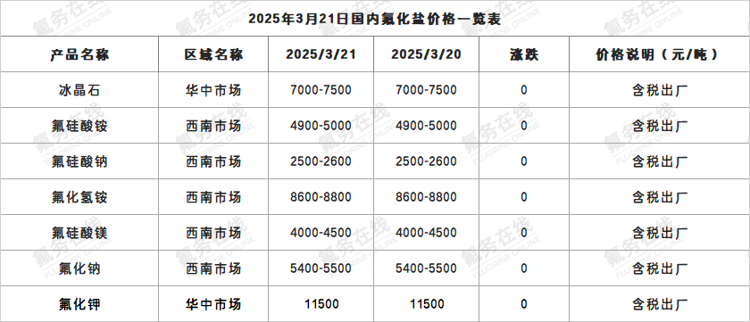 2025年3月21日国内氟化盐价格一览表
