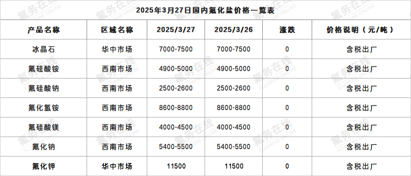 2025年3月27日国内氟化盐价格一览表