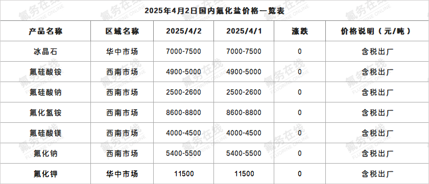 2025年4月2日国内氟化盐价格一览表