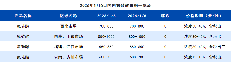 2026年1月6日国内氟硅酸价格一览表