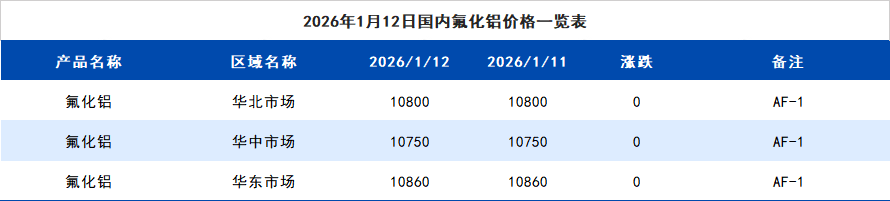 2026年1月12日国内氟化铝价格一览表