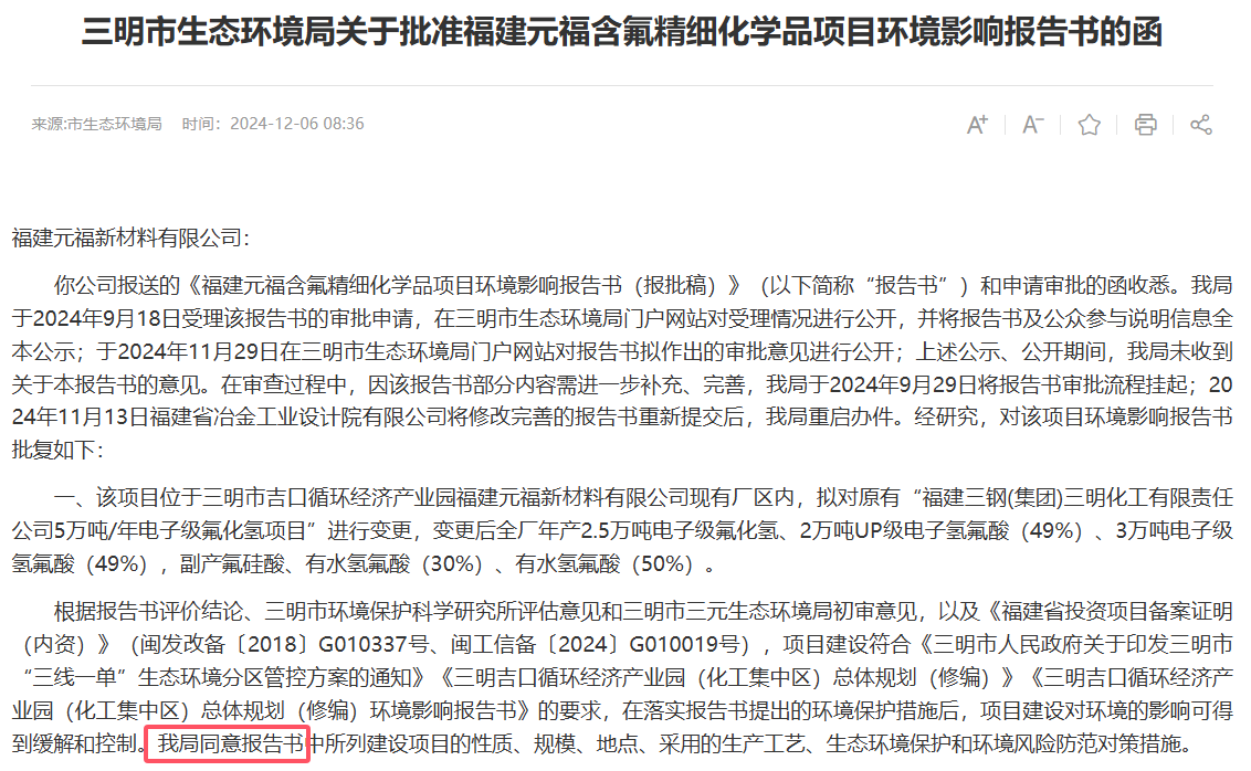 12月6日三明市生态环境局发布公告,就关于批准福建元福含氟精细化学品项目环境影响报告书的函,根据报告书评价结论、三明市环境保护科学研究所评估意见和三明市三元生态环境局初审意见,同意报告书中所列建设项目的性质、规模、地点、采用的生产工艺、生态环境保护和环境风险防范对策措施。